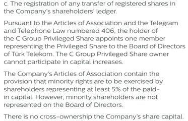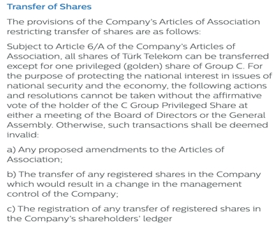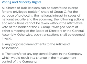 - Special shareholder rights (golden share) to block certain major decisions or to appoint one or more board members directly (common in state-owned enterprises).