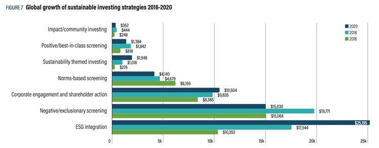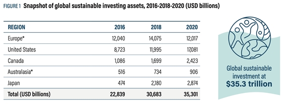 Global sustainable assets grew to a record $35.3 trillion in 2020, with a substantial proportion invested corporate equity or debt.